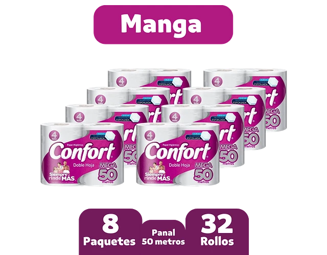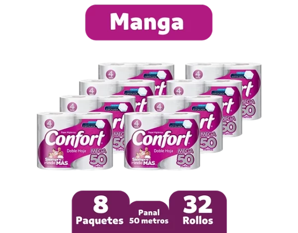 Papel higiénico Confort panal Mega rollo doble hoja 50 mts x 4 unid manga 32 rollos